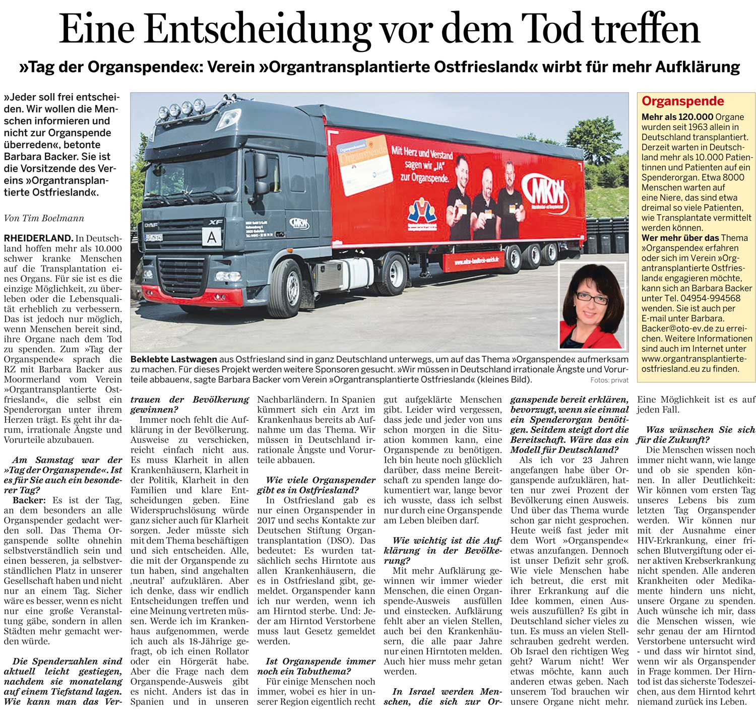 die Vorsitzende des Vereins »Organtransplantierte Ostfriesland«. Ein Bericht von Tim Boelmann aus der riehiderlandzeitung vom 04. Juni 2018.